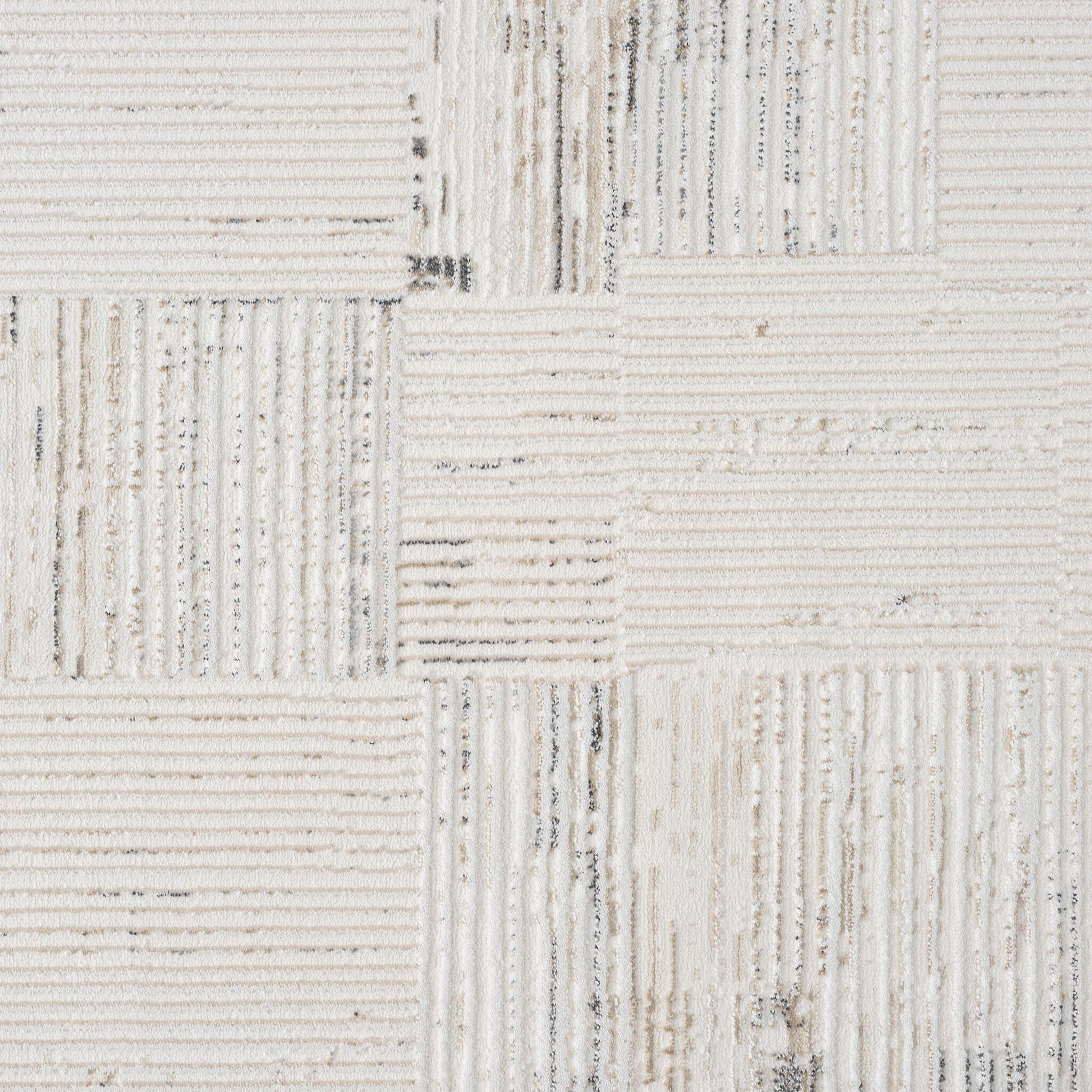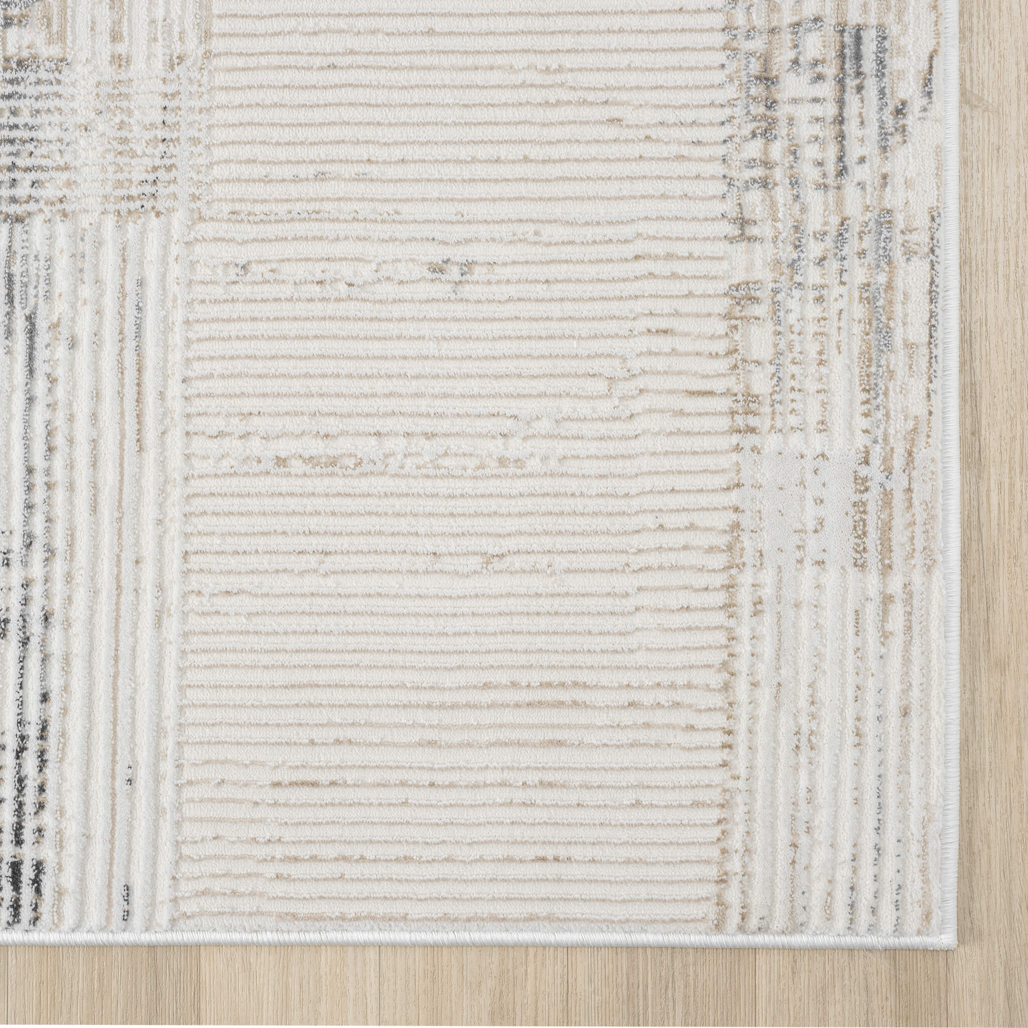 Beige and grey textured modern runner rug with abstract pattern, slim rectangular shape.