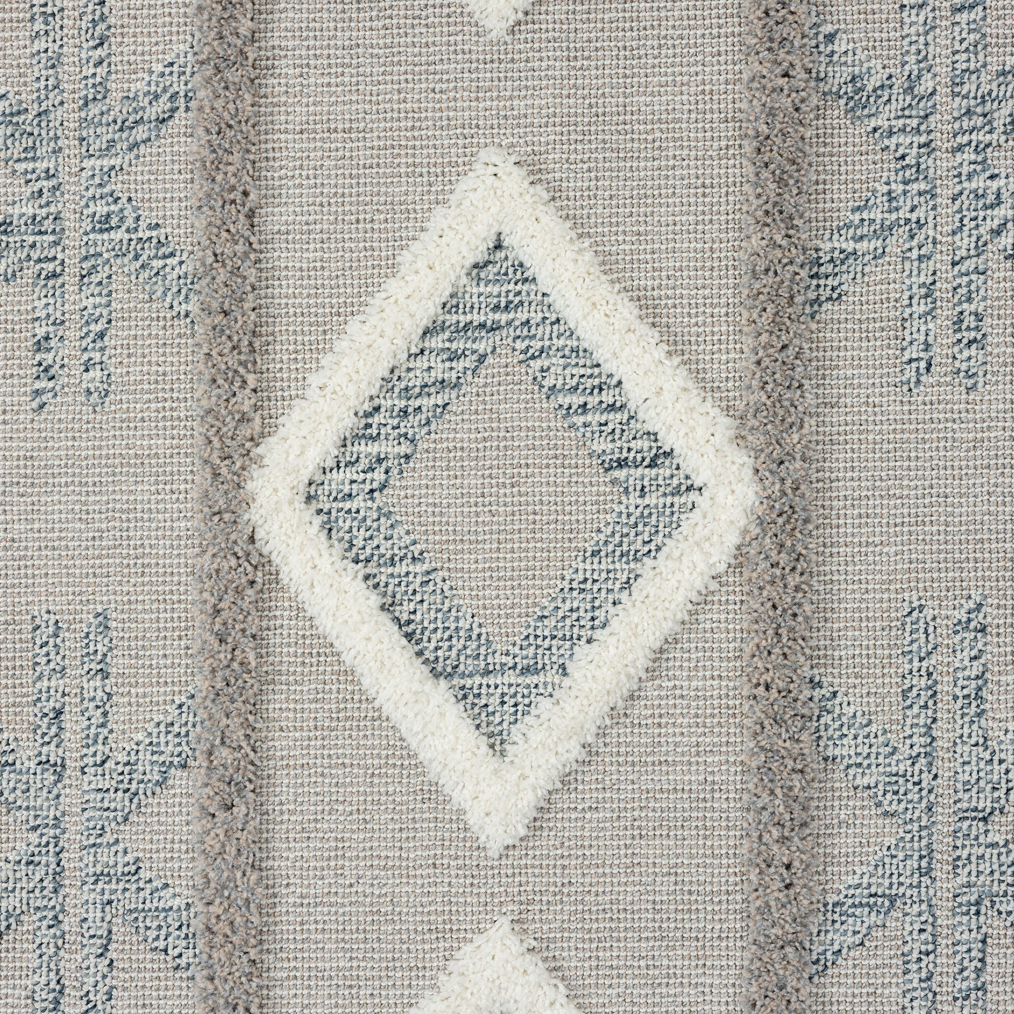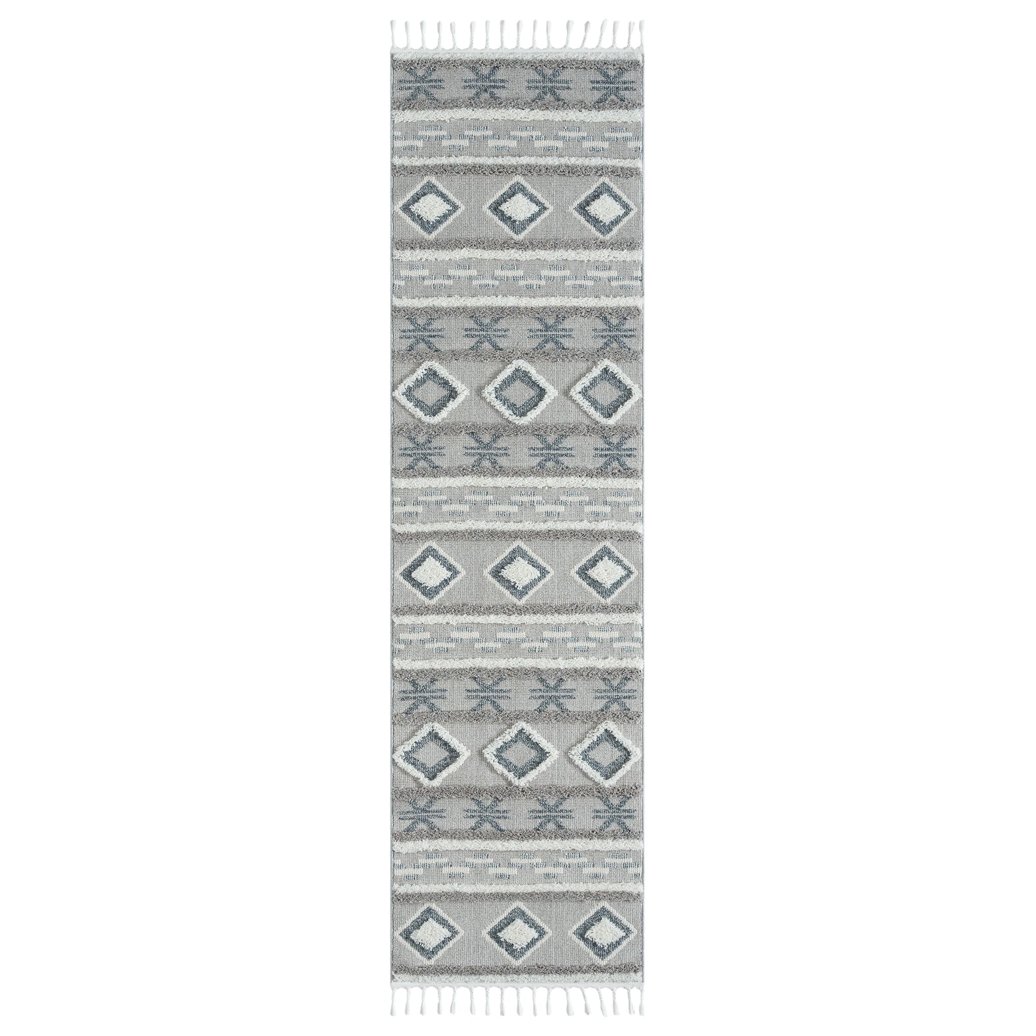 Grey and beige runner rug with modern geometric diamond and stripe pattern, fringed edges.