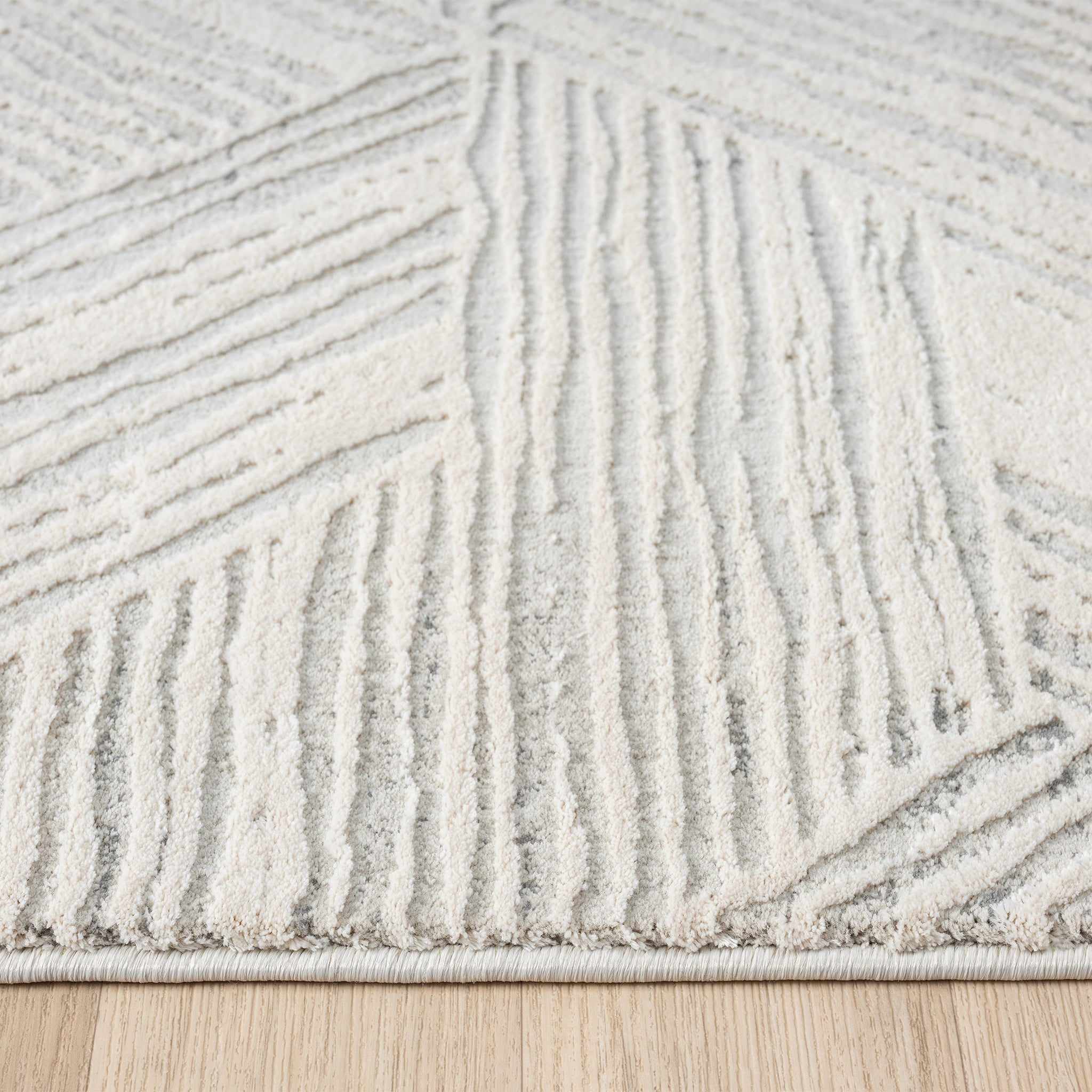 Light grey rug with overlapping geometric hexagon patterns and textured pile detail.