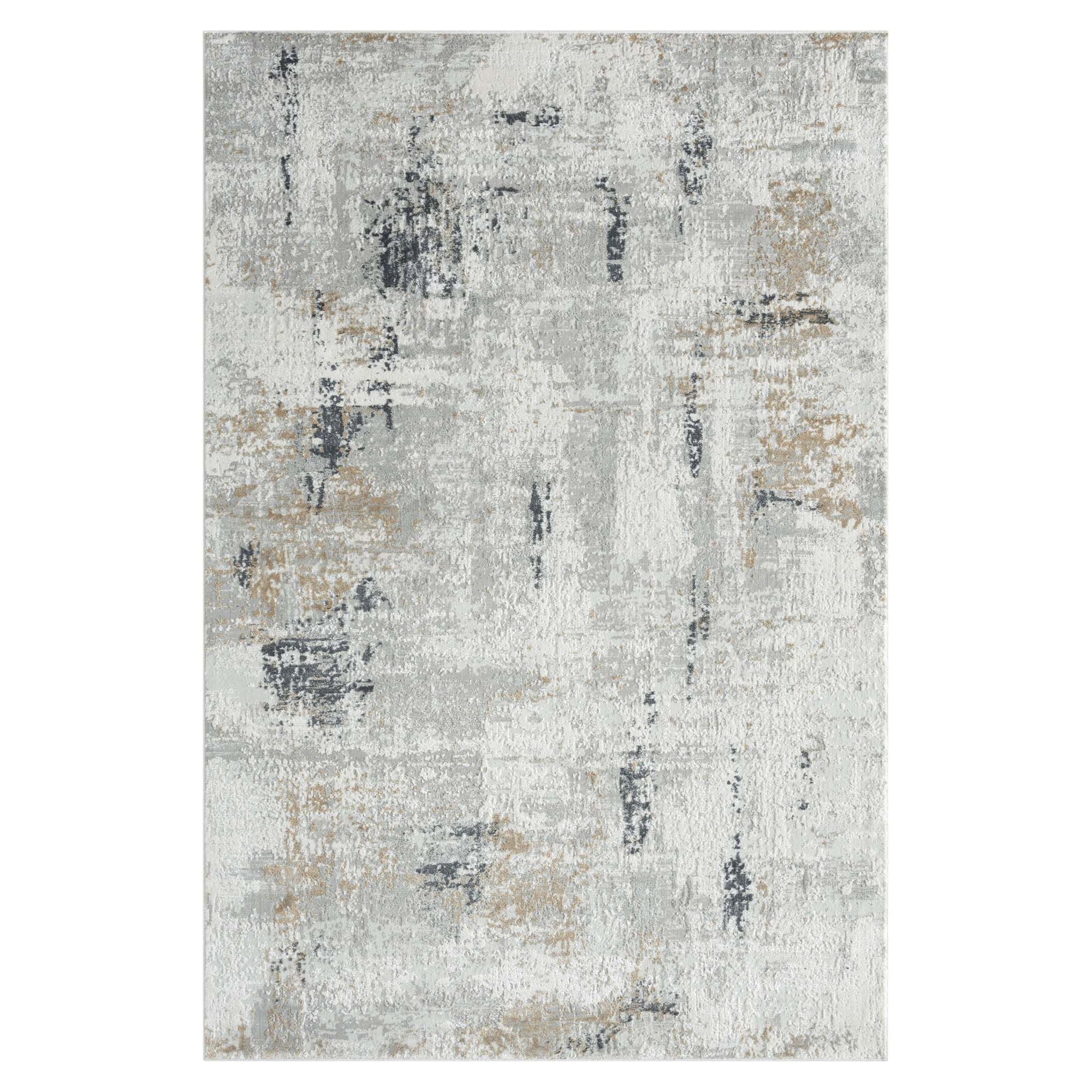 Grey multi-colored abstract rug with textured pile and subtle pastel accents.