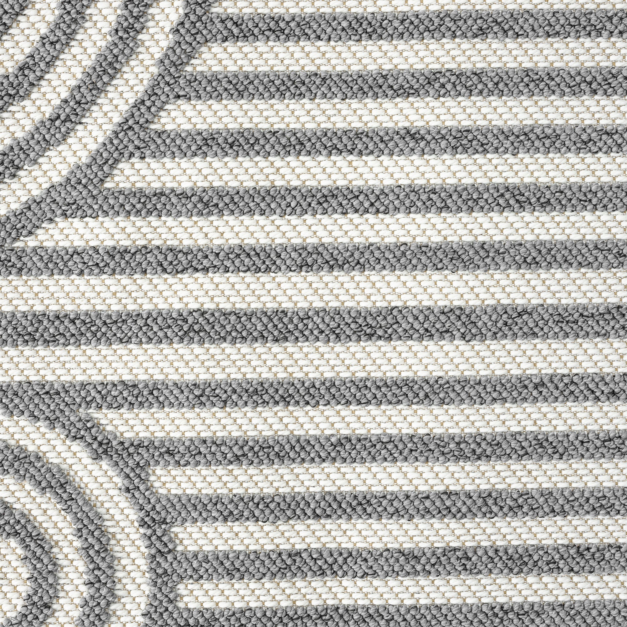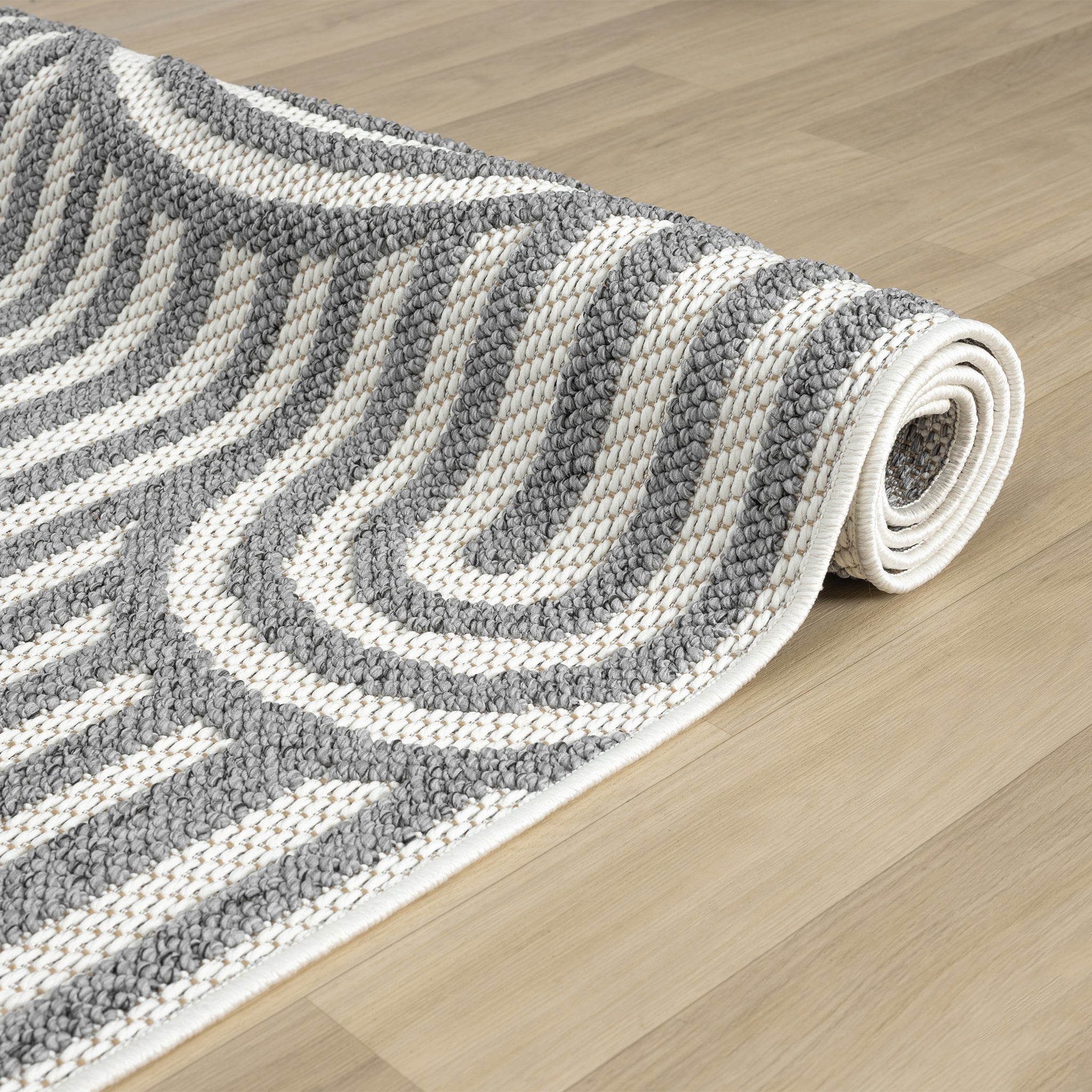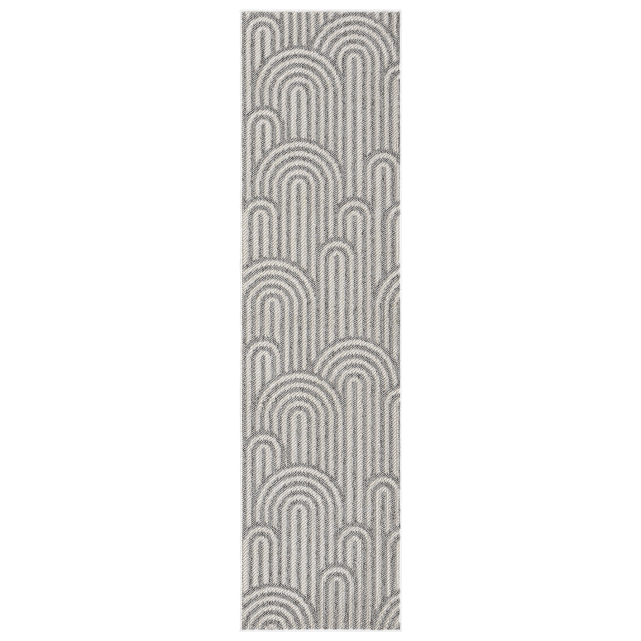 Grey flatweave runner rug with minimalist geometric arch pattern in monochrome tones.