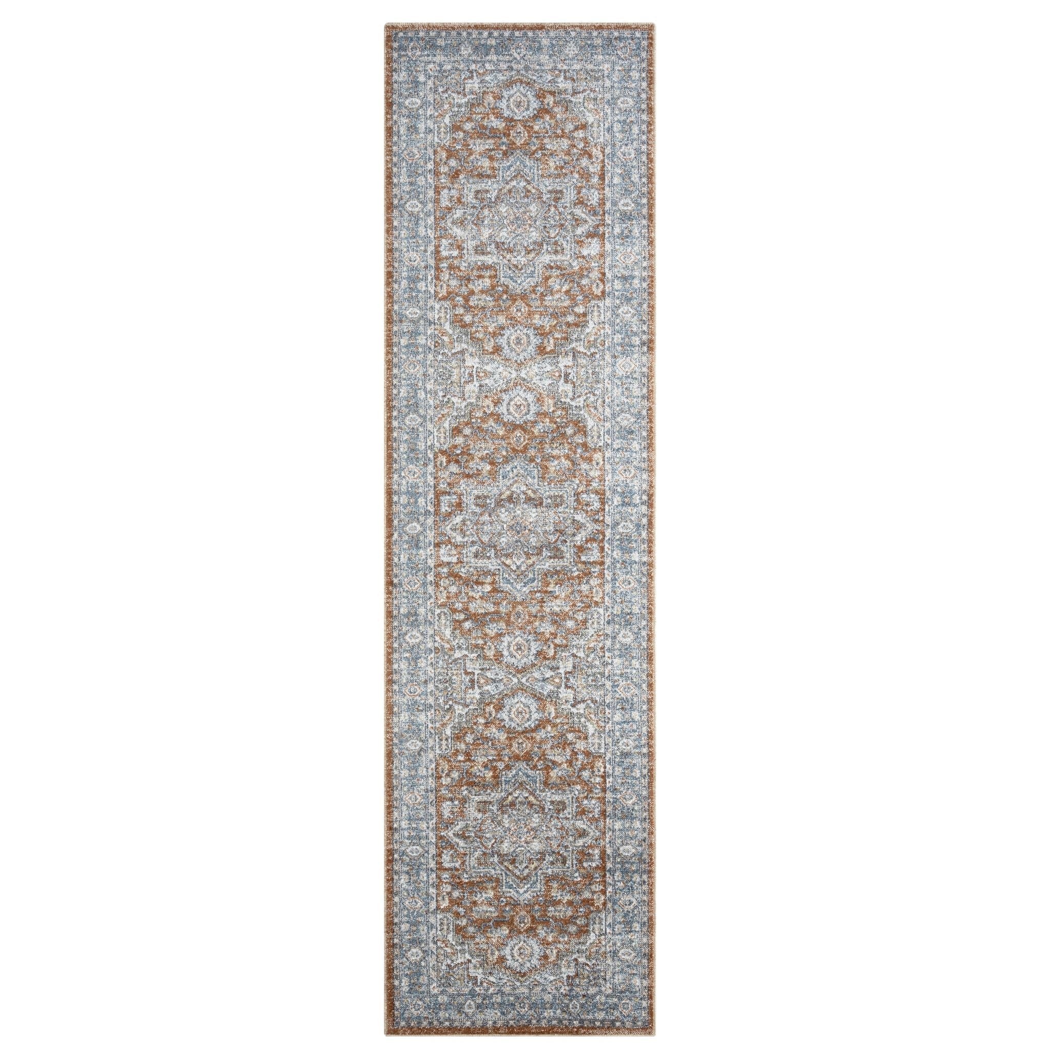 Narrow indigo runner rug with intricate beige and brown medallion pattern and faded distressed look.