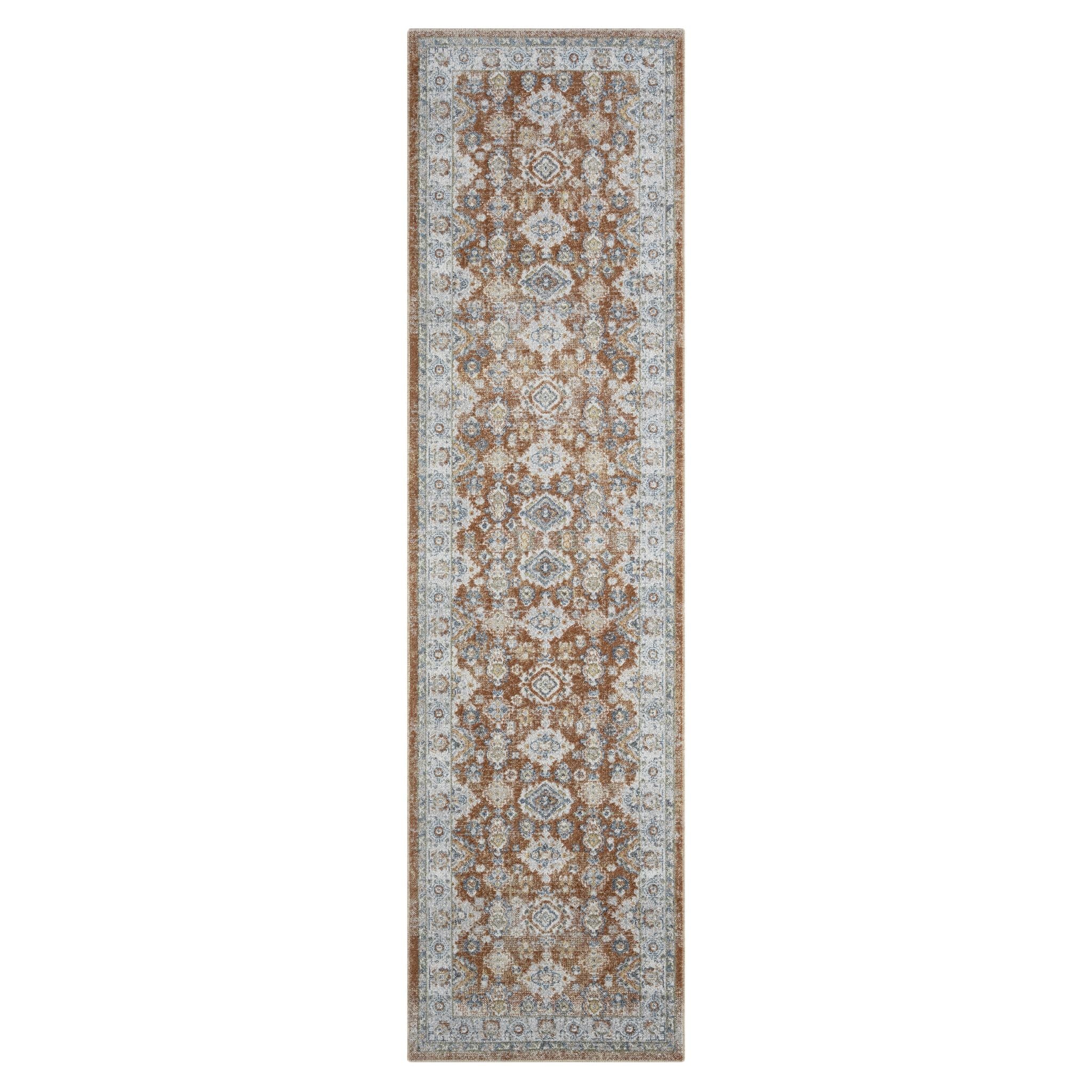 Runner rug with intricate brown and beige floral medallion pattern on a light blue-gray background.