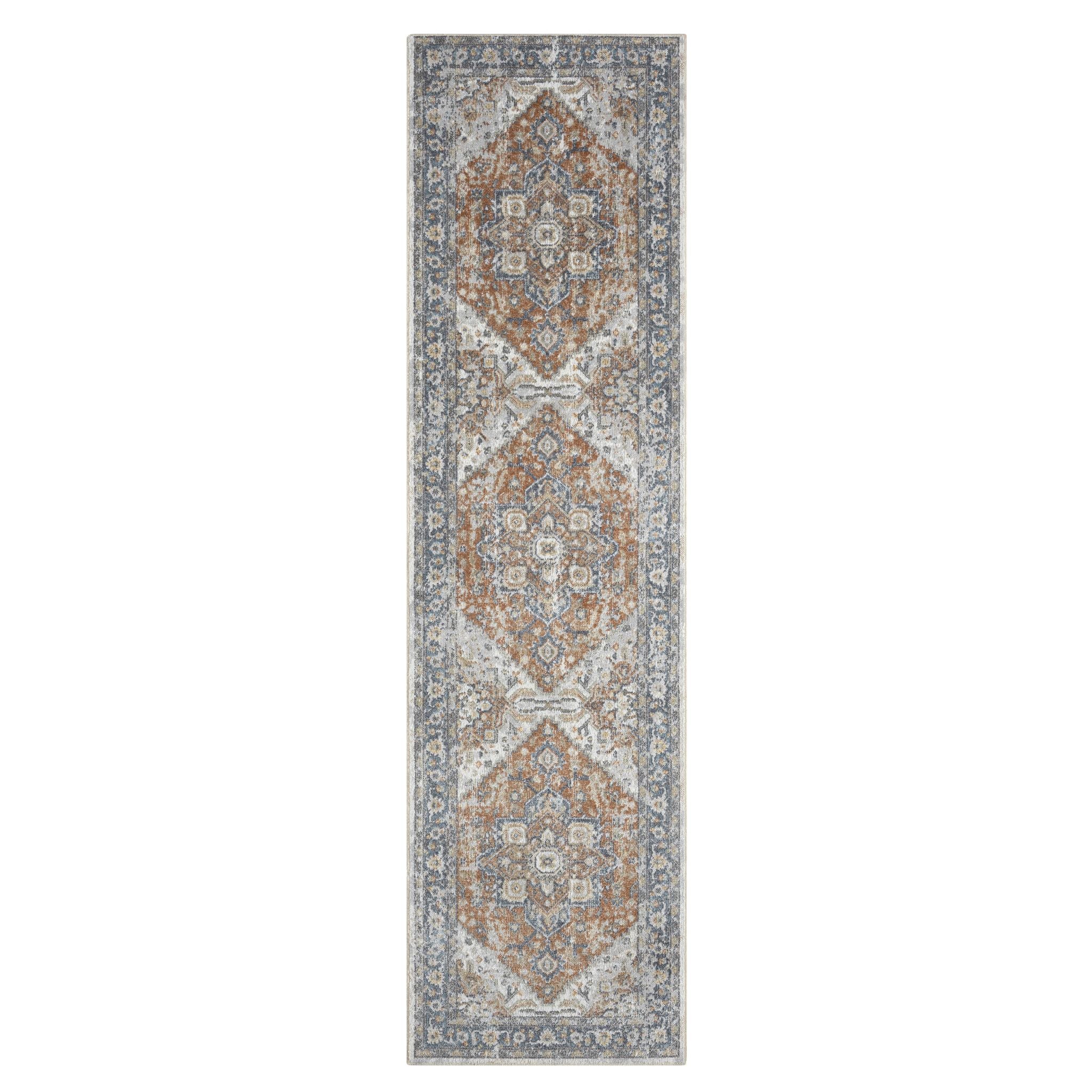 Narrow runner rug with intricate geometric and floral medallions in muted blue, beige, and rust tones on a textured.