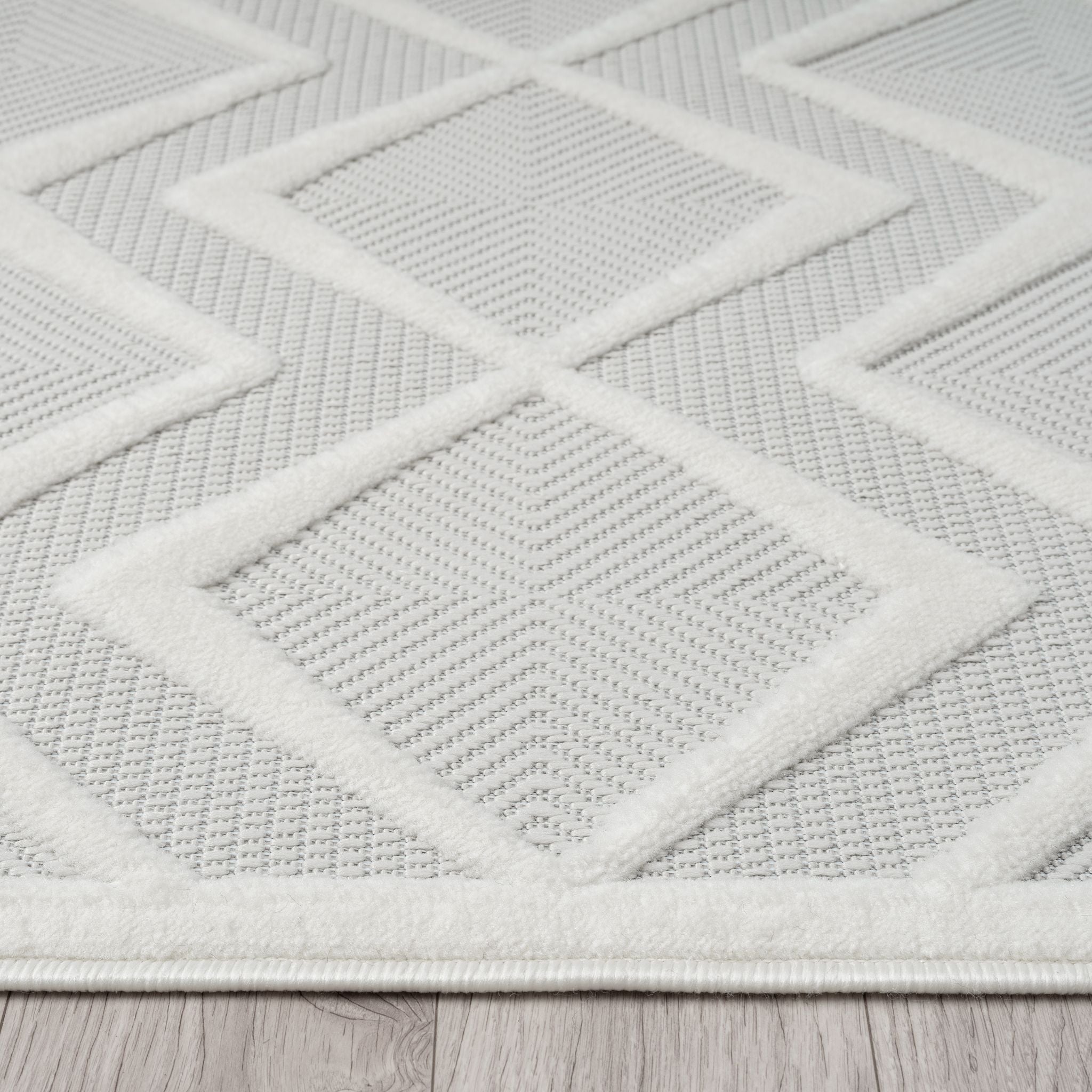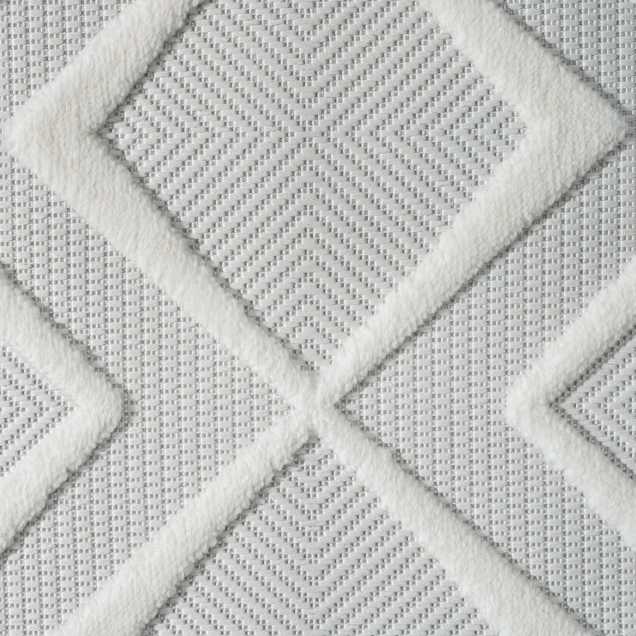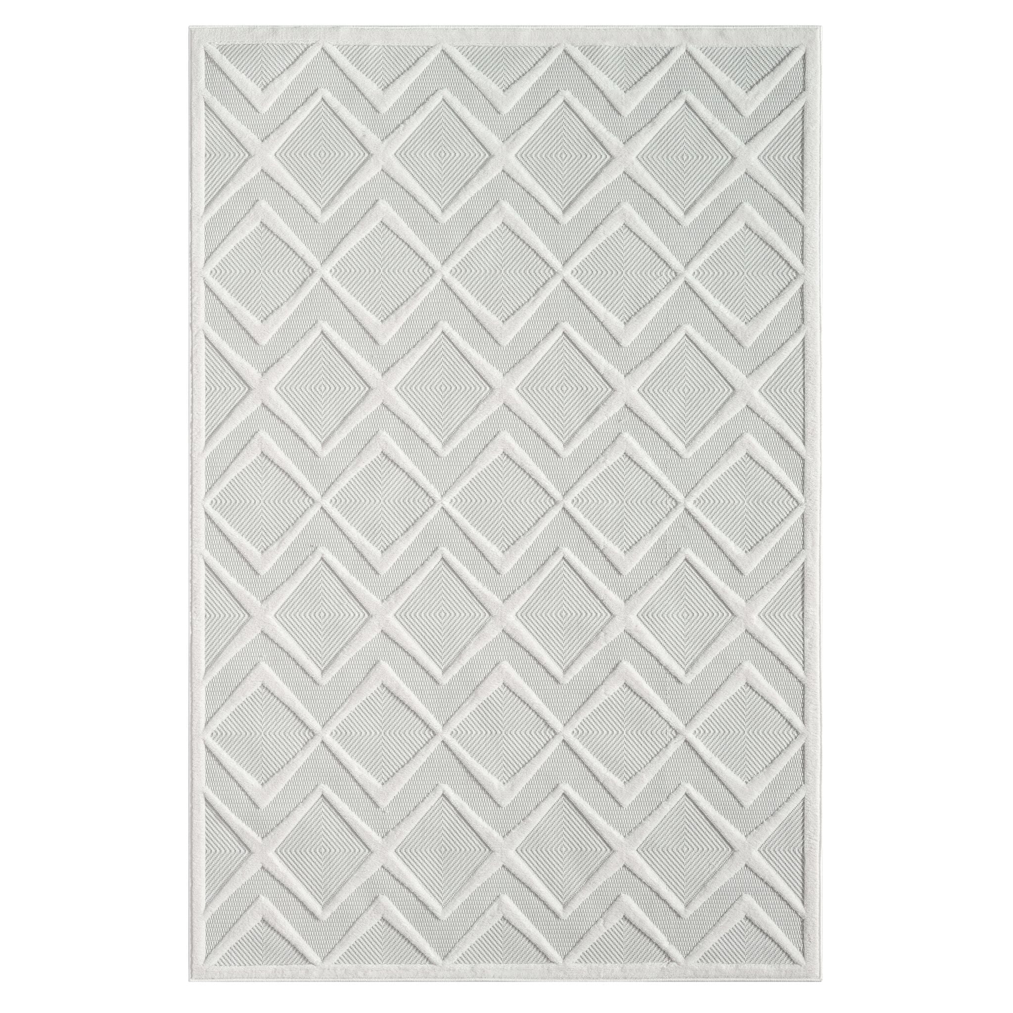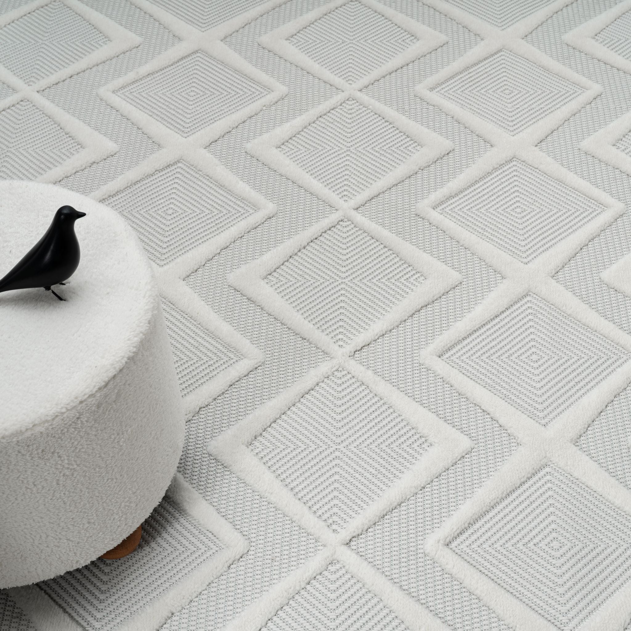 White modern rug with raised geometric diamond pattern and textured pile.