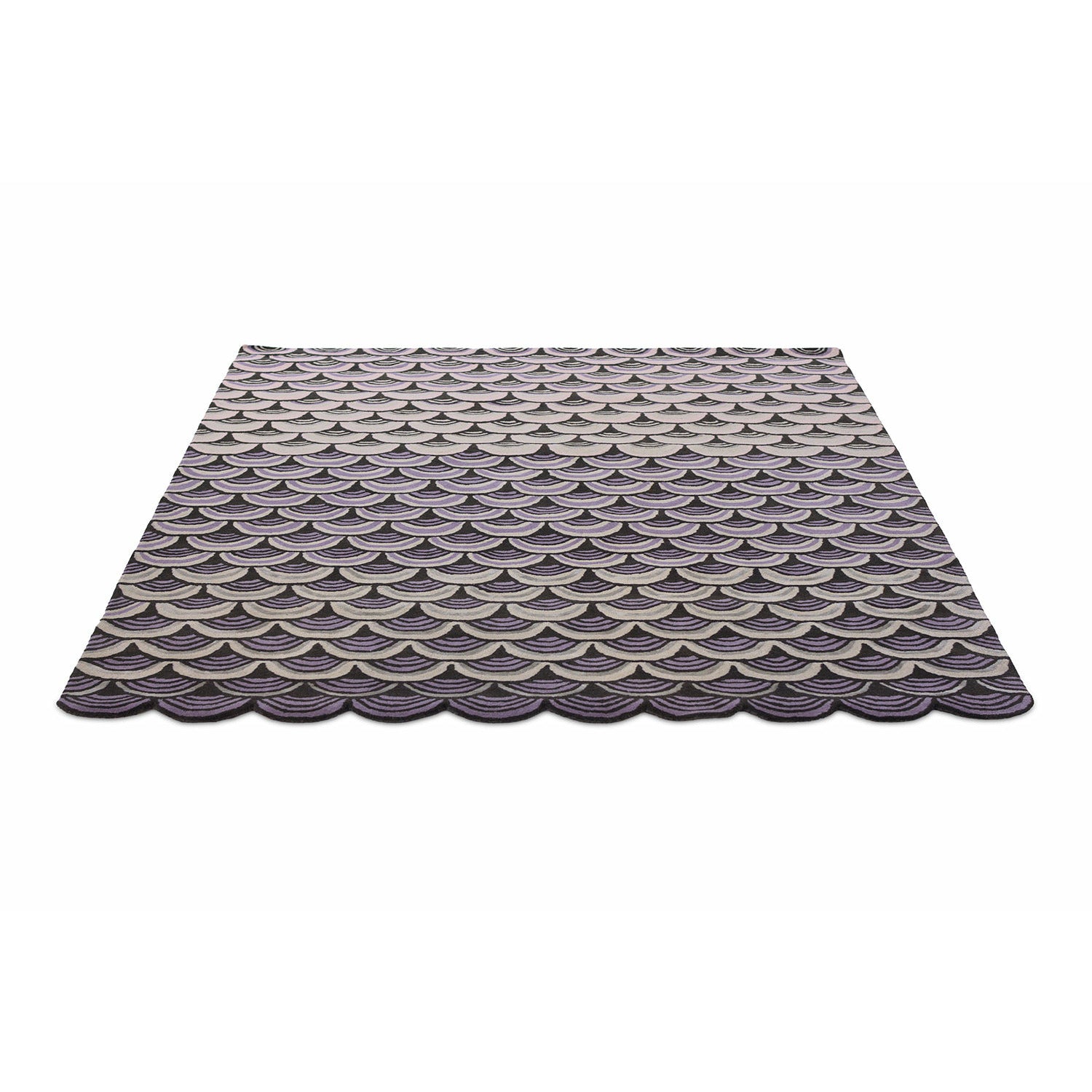 Finished with a scalloped edge, this luxurious rugs' colours and pattern flows in waves over the rug from the light pink to purple to create an illusion off additional dimensions. This retro design in gorgeous pink and purple tones has a plush, soft 12mm pile. Hand tufted and cut in India using wool and viscose, creating a textured and lustrous rug.